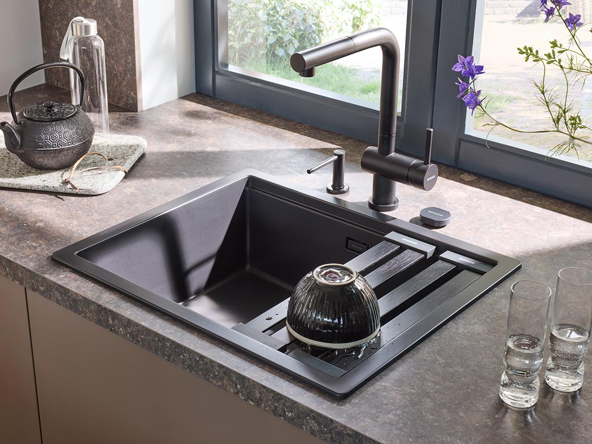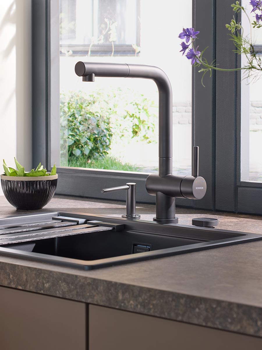 Bateria de bucătărie Schock Epos Window Cristadur  Crom cu cap extractibil, finisaj tip granit în nuanță negru intens, este concepută special pentru montaj în fața ferestrelor. Această versiune extinde populara gamă Epos, oferind o soluție practică pentru spațiile unde bateriile obișnuite nu pot fi instalate.